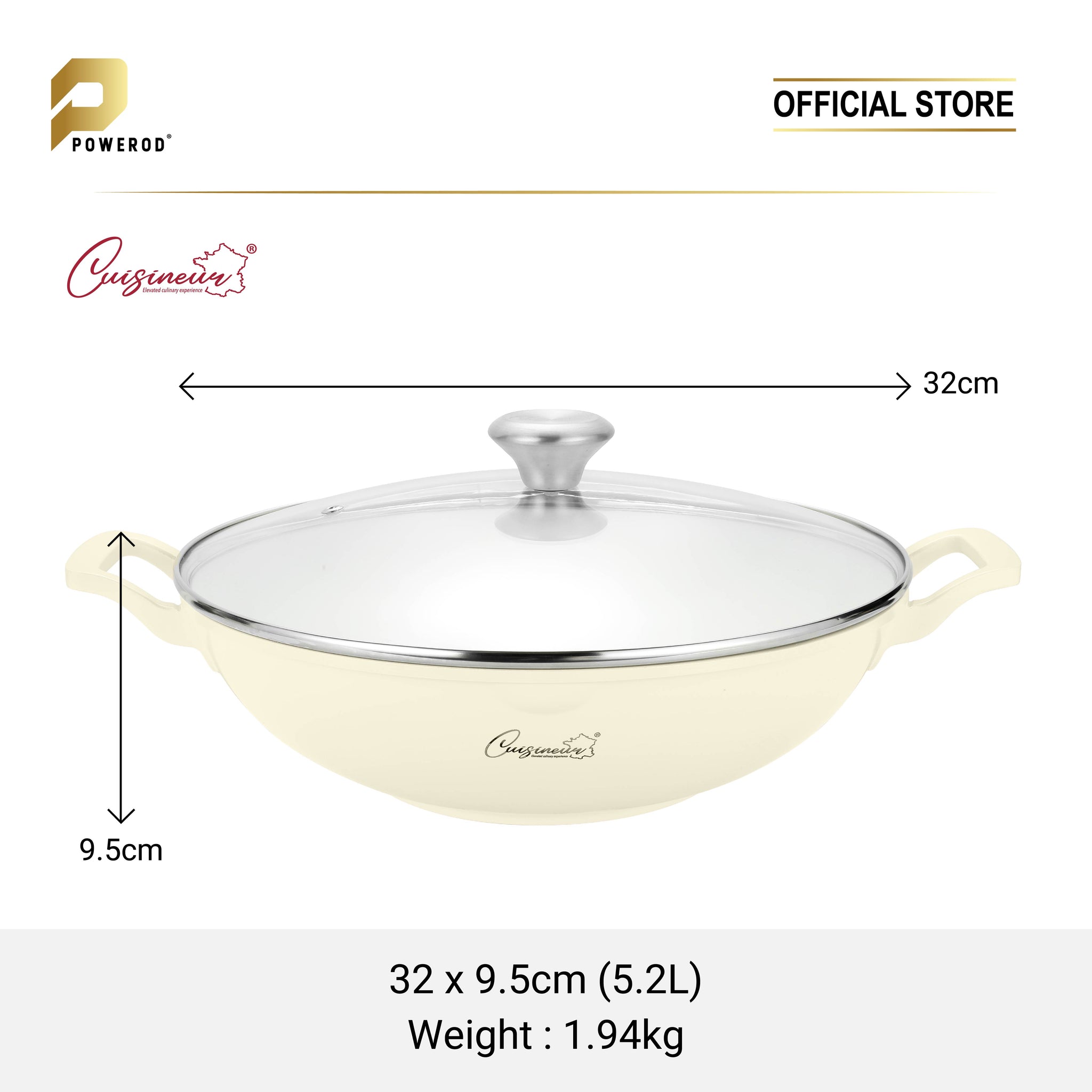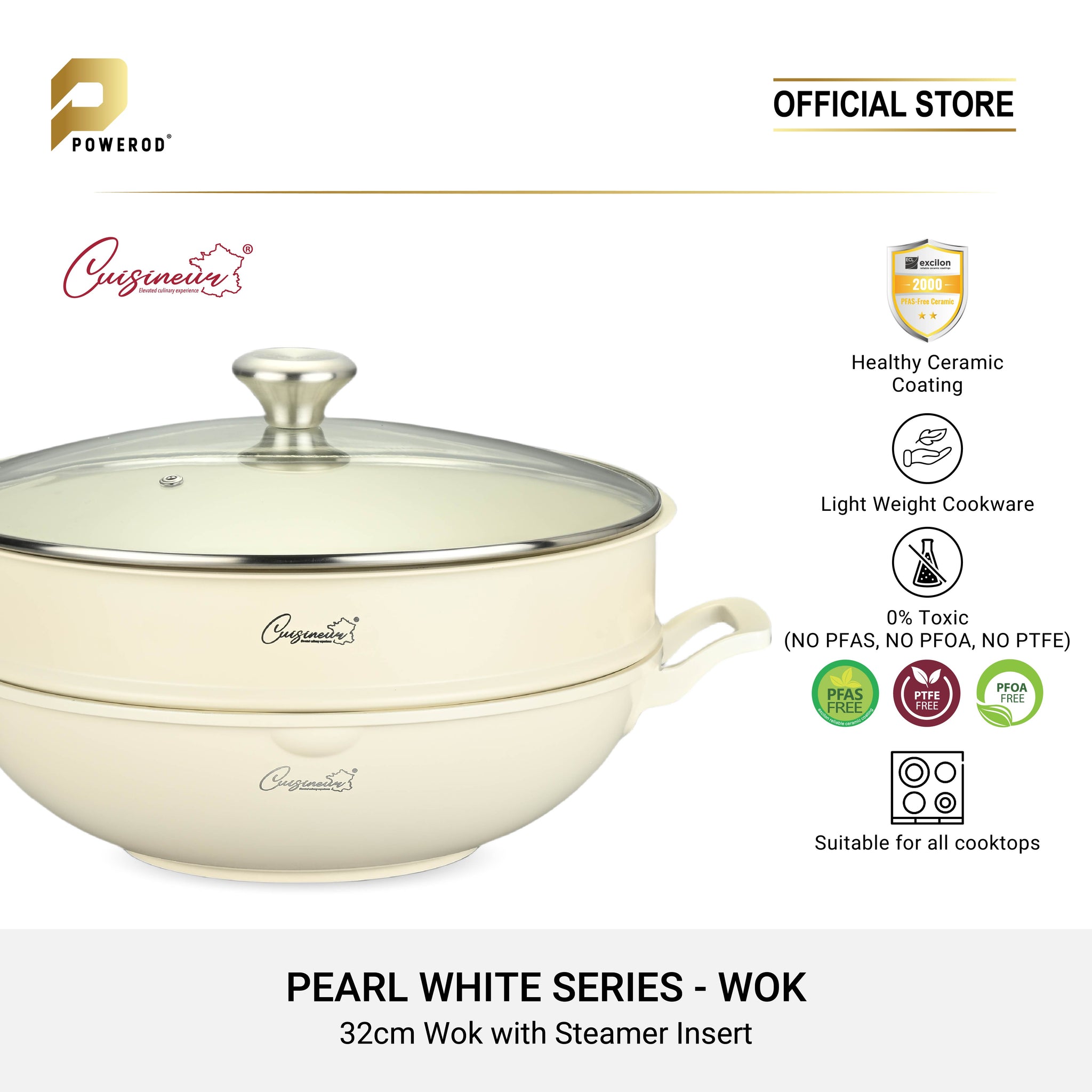 Cuisineur Pearl White IH 32cm Wok (Ceramic Non-stick coating) + Steamer rack