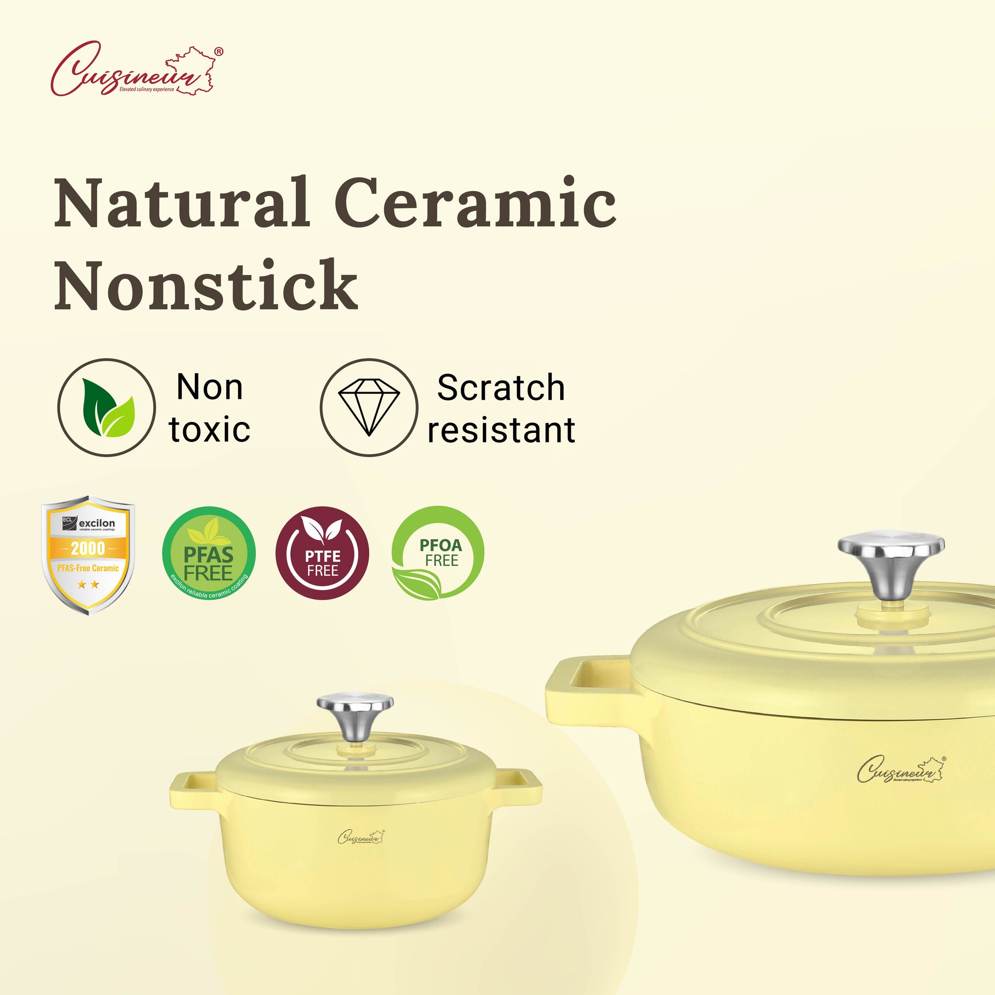 Upgrade your kitchen with the Cuisineur Pearl Yellow IH 2pcs Cookware set. This cookware set features a safe and healthy ceramic non-stick coating, perfect for your cooking needs.
